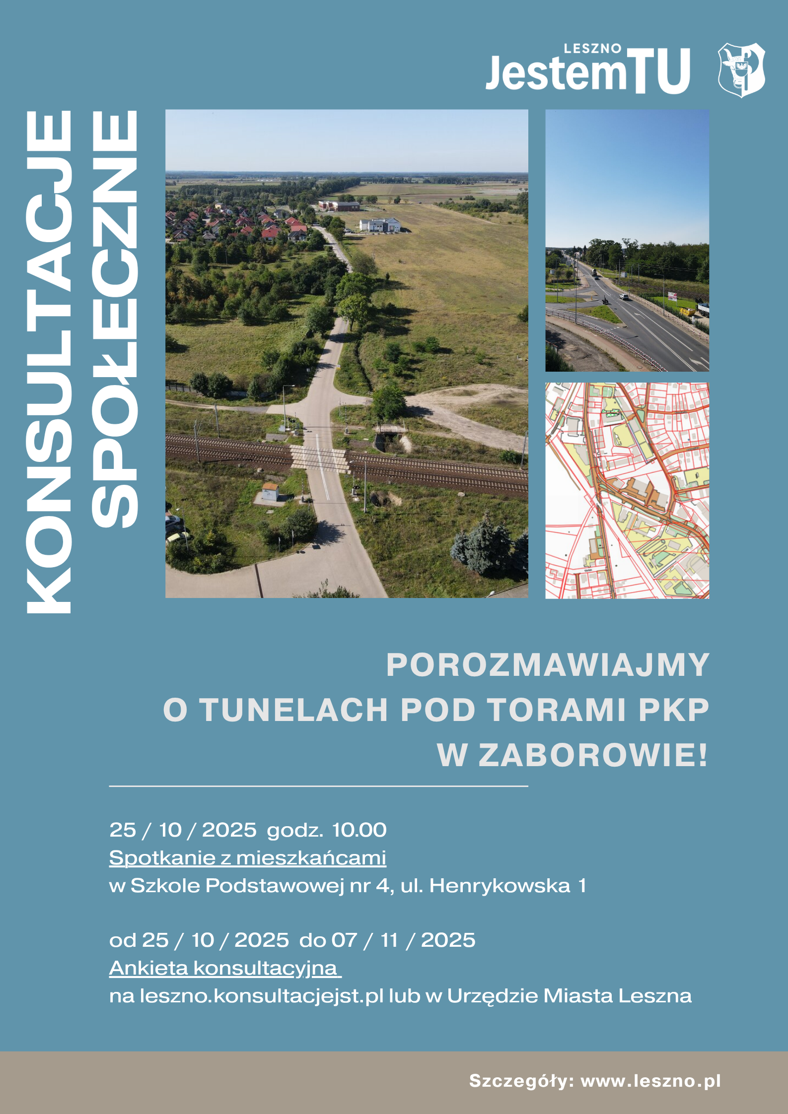 AktualnościW sobotę 25 października o godz. 10.00 w Szkole Podstawowej nr 4 (ul. Henrykowska) odbędzie się spotkanie konsultacyjne dotyczące budowy tuneli pod linią kolejową Wrocław – Poznań z jednoczesną likwidacją przejazdów kolejowo-drogowych w poziomie szyn w mieście Lesznie.