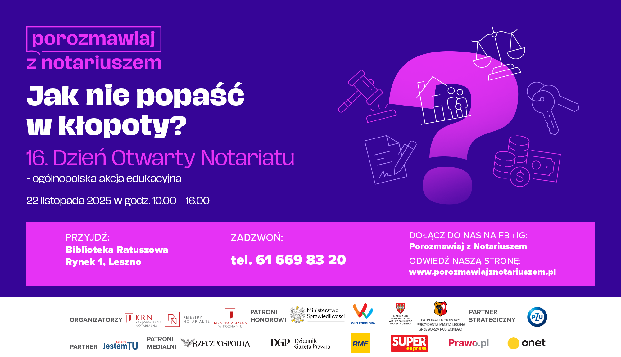 Rolą notariuszy jest zapobieganie sporom, stratom i nieporozumieniom jeszcze zanim do nich dojdzie. Dlatego też przesłanie tegorocznej edycji Dnia Otwartego Notariatu brzmi: Jak nie popaść w kłopoty? Porozmawiaj o tym z notariuszem. Podczas ogólnokrajowej akcji osobiście będzie można skorzystać z porad notariuszy w Bibliotece Ratuszowej w Lesznie przy ul. Rynek 1, telefonicznie oraz online, także poprzez kanały w social mediach.