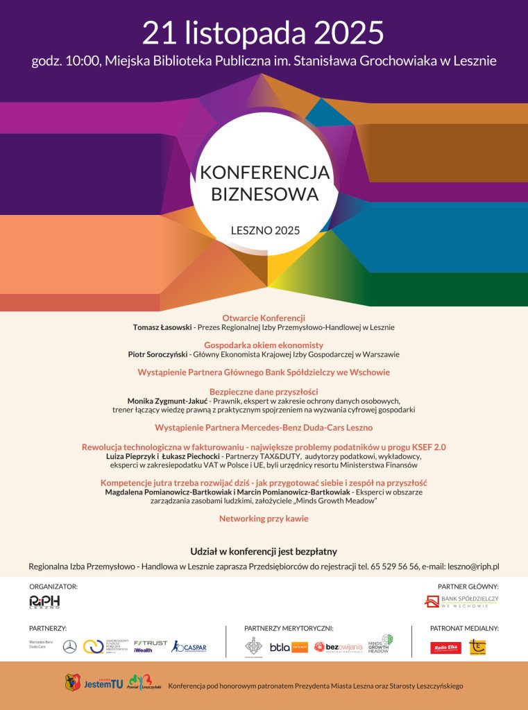 Regionalna Izba Przemysłowo – Handlowa w Lesznie zaprasza przedsiębiorców, liderów i osoby zainteresowane rozwojem biznesu na trzecią edycję wydarzenia, które łączy merytorykę, inspirację i networking. To doskonała okazja, by posłuchać ekspertów, wymienić doświadczenia i poznać wyzwania współczesnej gospodarki.