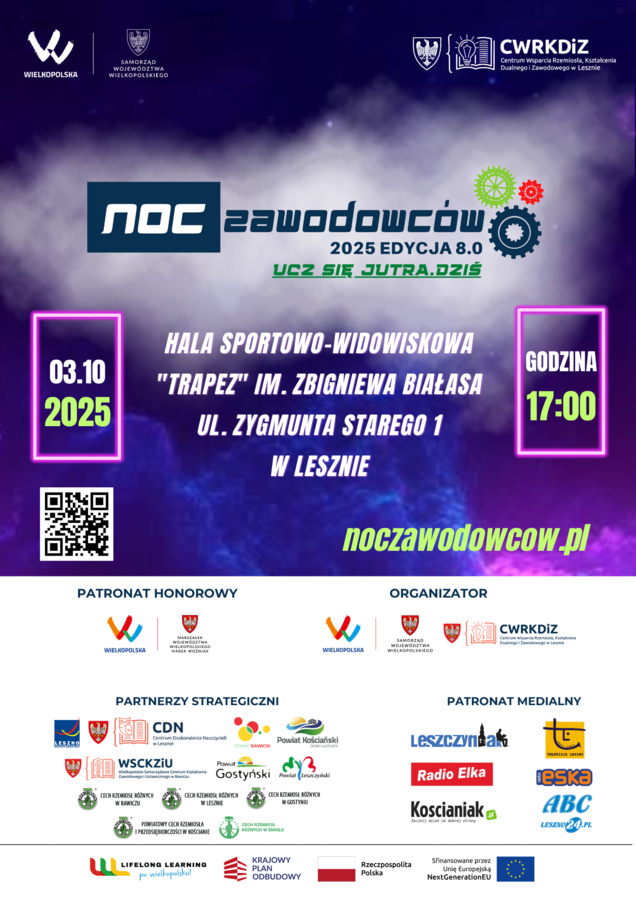 Już niebawem Leszno po raz kolejny stanie się miejscem niezwykłego wydarzenia, które od lat inspiruje młodzież, rodziców i wszystkich zainteresowanych edukacją i rynkiem pracy. NOC ZAWODOWCÓW to niepowtarzalna okazja, by w atmosferze dobrej zabawy odkryć świat nowoczesnych zawodów i poznać ścieżki kariery, które otwierają drzwi do sukcesu.