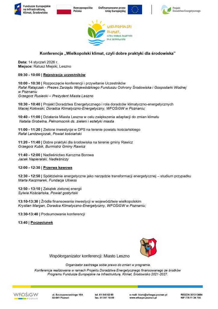 Konferencja organizowana jest w ramach kampanii „Wielkopolski klimat, czyli dobre praktyki dla środowiska”, podczas której w pięciu subregionach Wielkopolski zorganizowane zostaną wydarzenia stanowiące platformę wymiany doświadczeń jednostek samorządu terytorialnego.