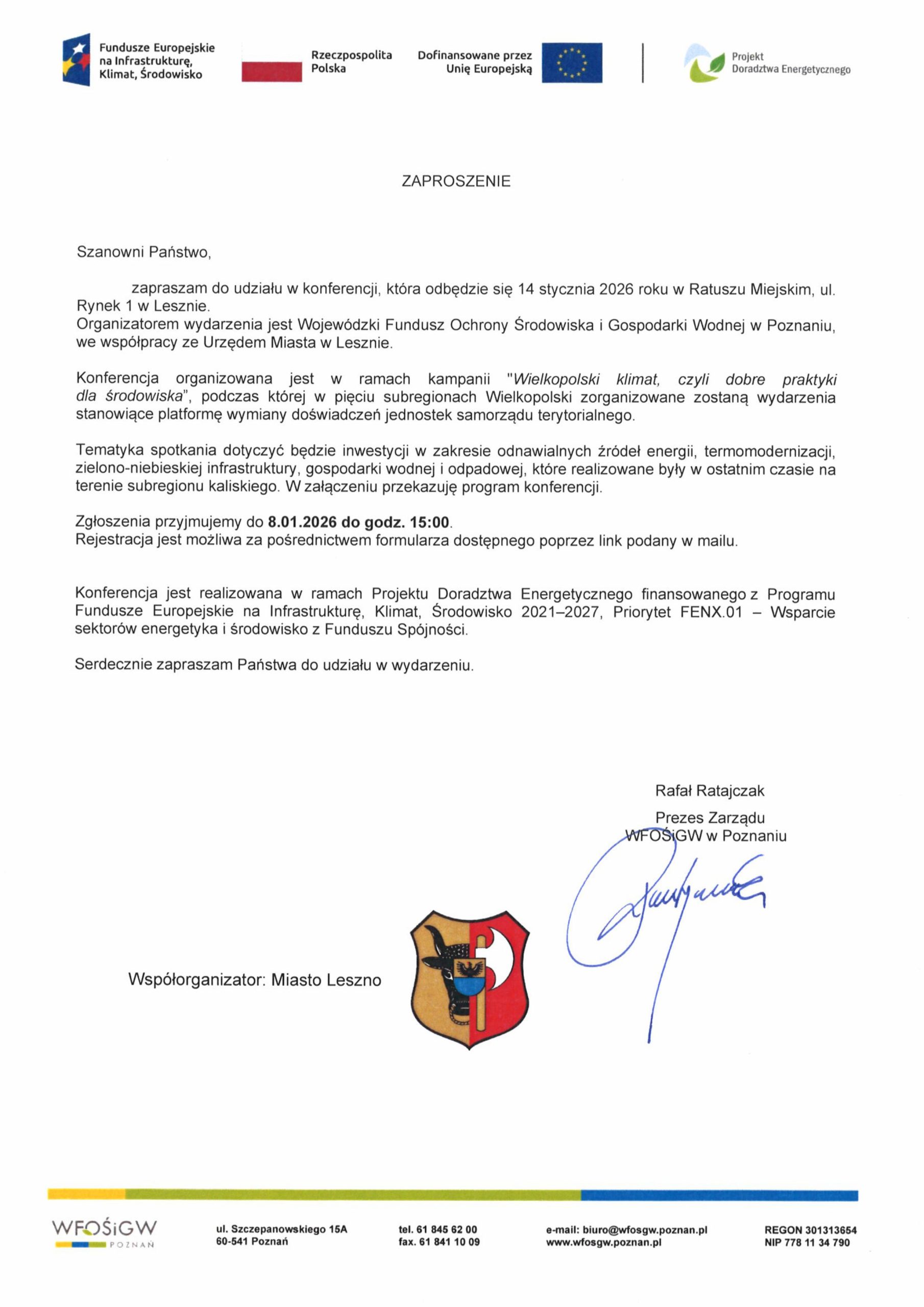 W imieniu Prezesa Zarządu Rafała Ratajczaka, zapraszamy na konferencję subregionalną pt. „Wielkopolski klimat, czyli dobre praktyki dla środowiska”, której organizatorem jest Wojewódzki Fundusz Ochrony Środowiska i Gospodarki Wodnej w Poznaniu.
